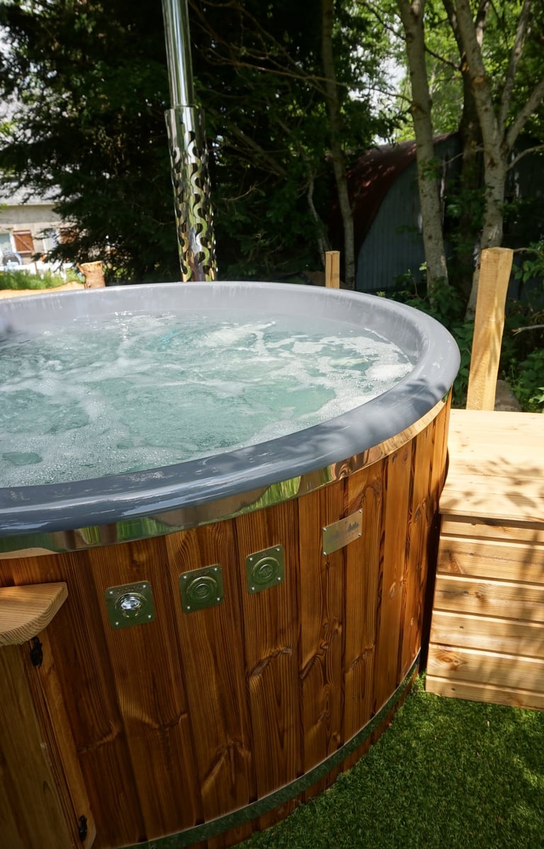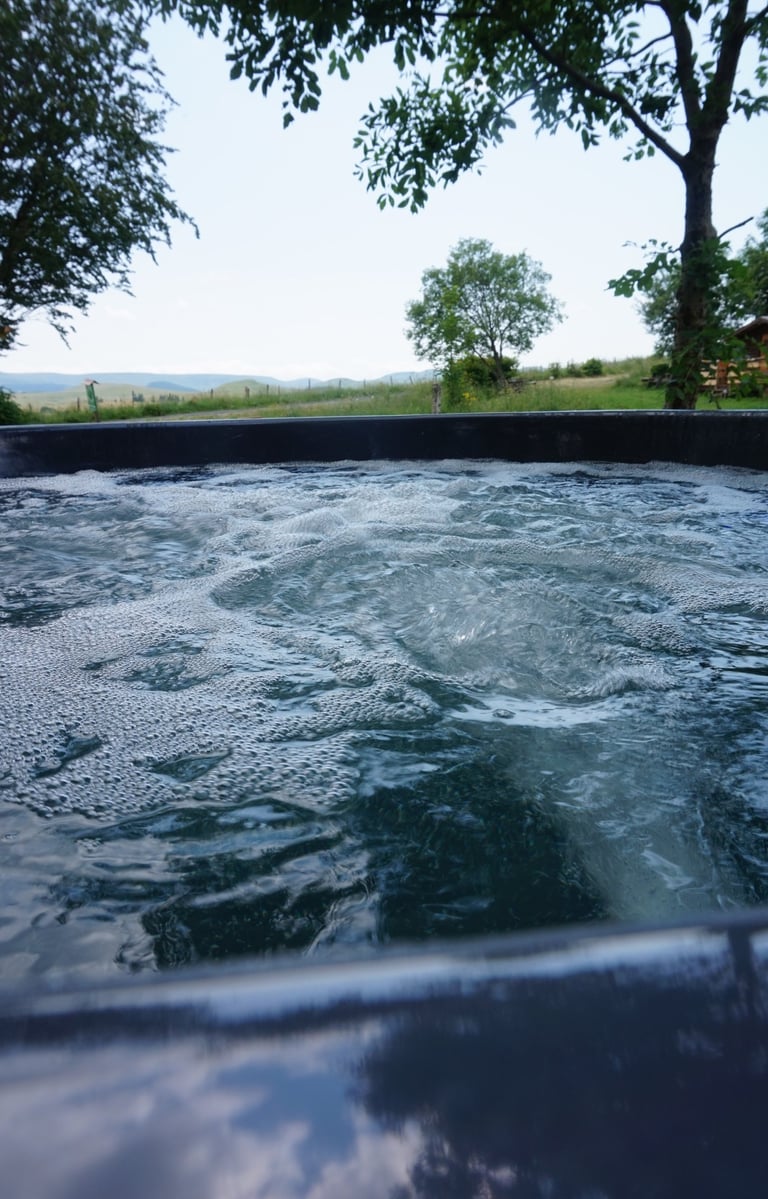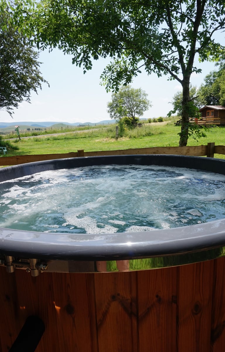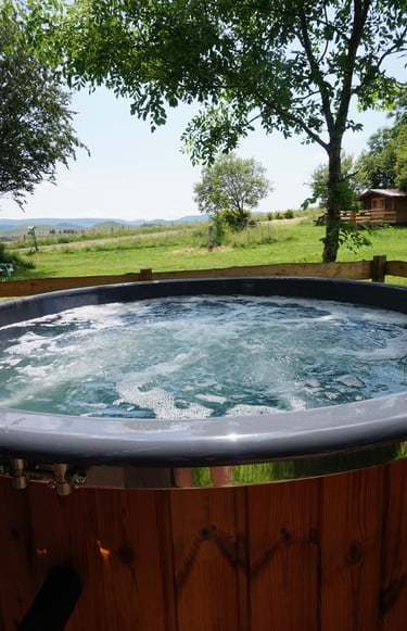 Plongez dans le bien-être avec notre bain nordique offrant une vue sur le Cézallier.